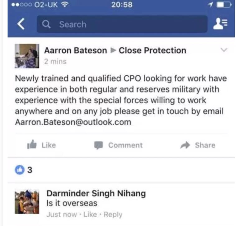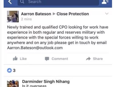 Oh what a gift we have. Welcome to the world of Aarron Bateson and what a gem he is.It became apparent to a few of our members from his very first post on a close protection Facebook page that something wasn’t quite right with Aarron and his claims were more fishy then billingsgate market on a good day.