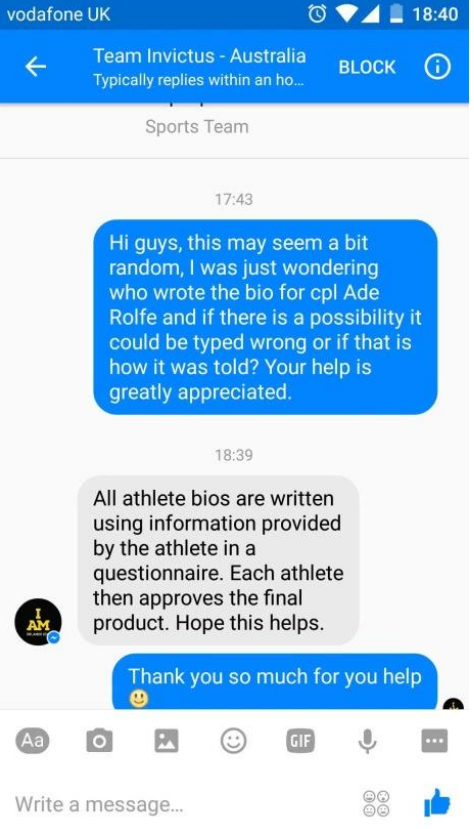 Once he knew his old work mates and the WMHCHQ were on to him he deleted his Twitter account and got his bio changed. Strange as confirmation was gained from Invictus that each bio is viewed by the individual to make sure it’s factually correct.