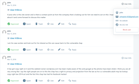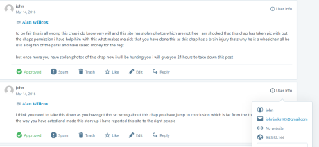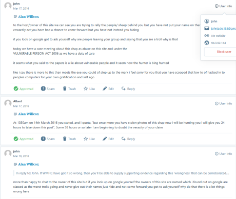 Firstly we looked more closely as some of the comments on this blog to work out when the person behind Tinklesplash first started commenting. We then looked at other posts by disgruntled Walts or those claiming to be acting on a Walts behalf and identified a common trend in writing style of a set of posts dating back to 2016. After we had exposed Alan Willcox from Southampton and poster called John started posting on the blog protesting for Willcox and playing the disability card.