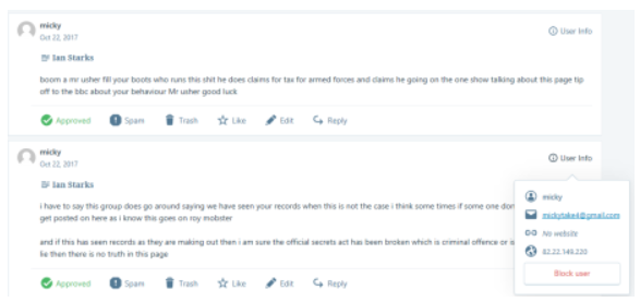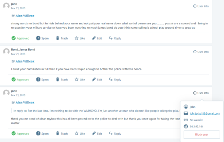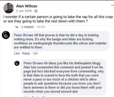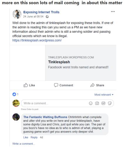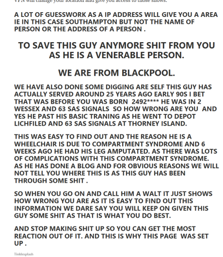 At first we ignored the ramblings of the page for what it was. deranged babble created by nothing more then an outraged Wankspangle, angry for being exposed and wanting some kind of control of the situation and a feeling of self importance, after all we took away his fake military identity which he used to gain admiration from the general public.