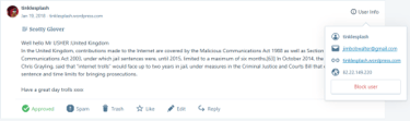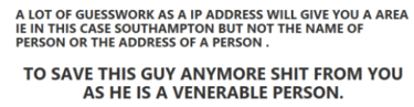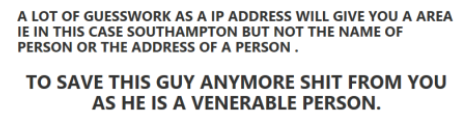It was identified that each of the five email addresses linked to ’Tinklesplash’ have at some time been used to post messages to WMHC from IP address 82.22.149.220, this IP address belongs to virgin Media and is issued within the Southampton area.