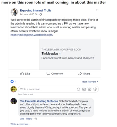 However, the page started taking a more sinister tone, highlighting anyone who commented on our page and making up some of the most outrageous claims in order to blacken their names and internet footprint.