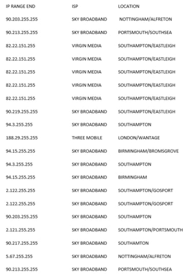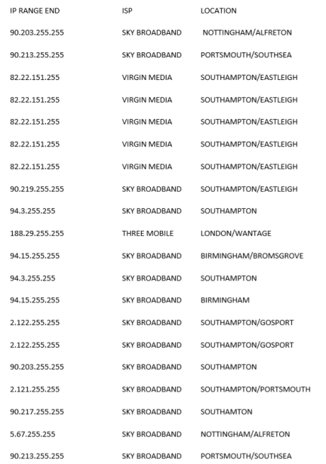 Our guys looked at each of the IP addresses to resolve the ISP and approximate location, each of which pointed to the Southampton area. To be clear Virgin Media and Sky are both residential providers and there is no way these IP addresses are used by VPN providers, VPN providers tend to have servers in data centres as they would not be allowed to use residential ISPs and the bandwidth would not be sufficient.