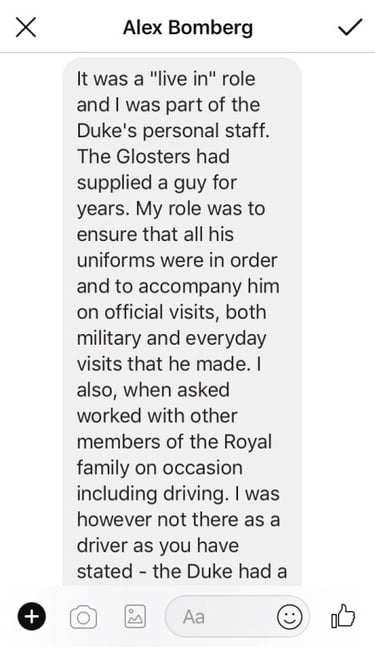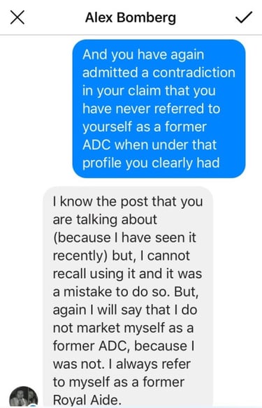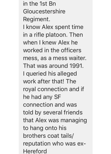 Alex has made claim that he was an Aide De Camp (ADC) to members of the British Royal Family, an ADC is a position only for senior military officers,