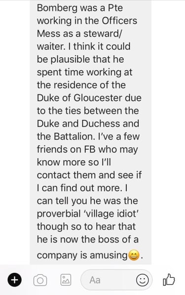 Private Alex John Bomberg served in the Gloucester Regiment between 1991 and 1995, Alex was an Officers Mess waiter. In 1996 to 1997 Alex was a driver based at Kensington Palace.