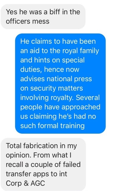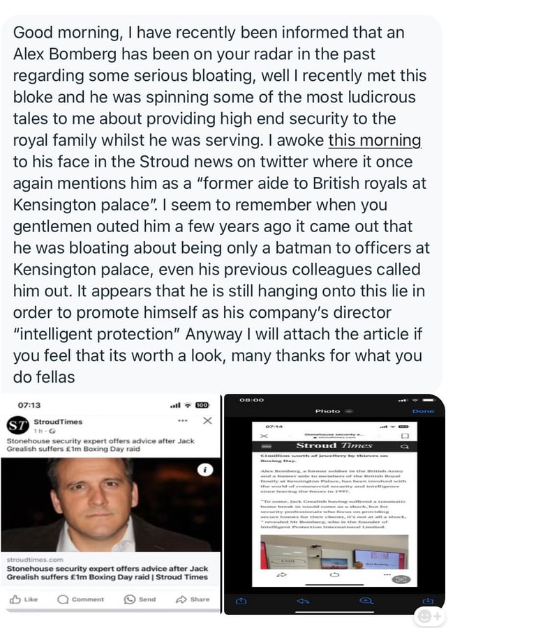 These claims Mainly to media outlets and those he seeks business from. Obviously the likes of Sky News and other news outlets are not going to seek royal security advice from a former PTE who was a mess waiting, a driver/Batman.