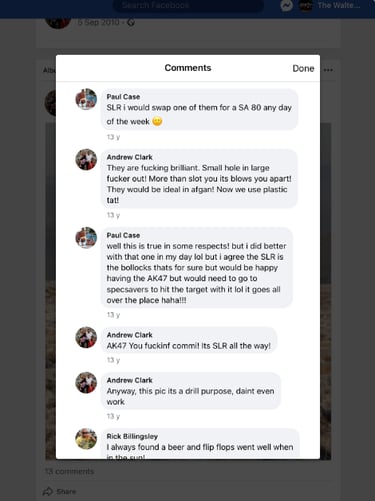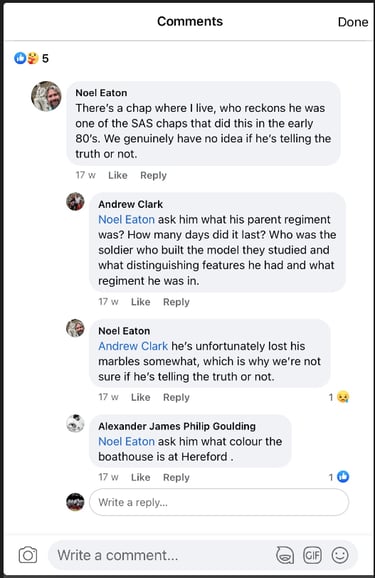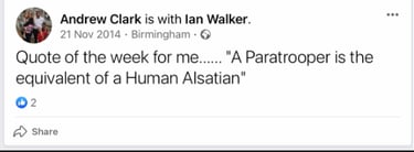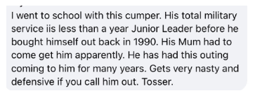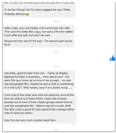 After several more of the same replies it became plainly obvious his name was doing the rounds on closed groups, including the parachute regiment with a full nil return. But then again someone who only managed four weeks a junior Para, pirbright is not going to be remembered.