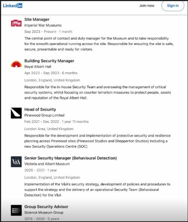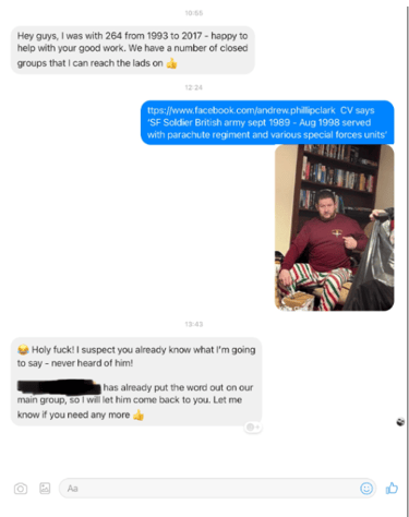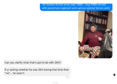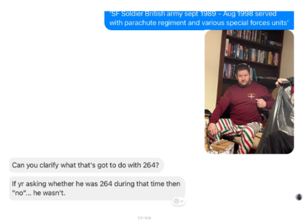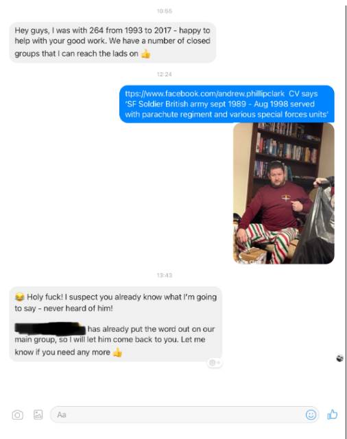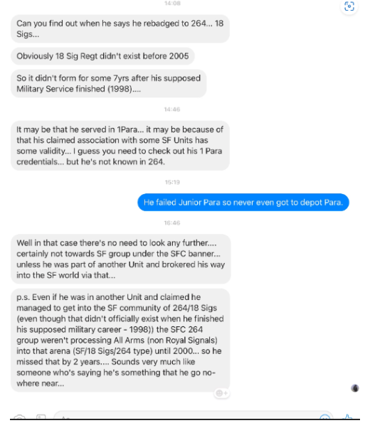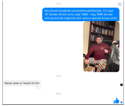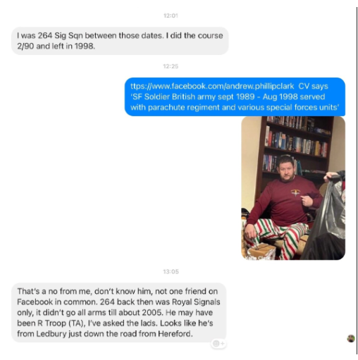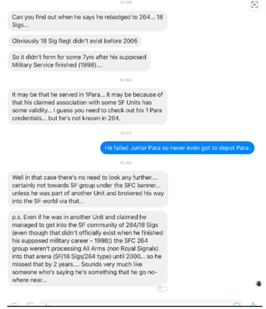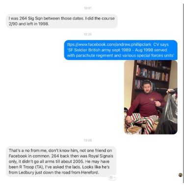 We were able to view emails and a CV which clearly stated ‘SF Soldier British army sept 1989 – Aug 1998 served with parachute regiment (1 Para) and various special forces units’