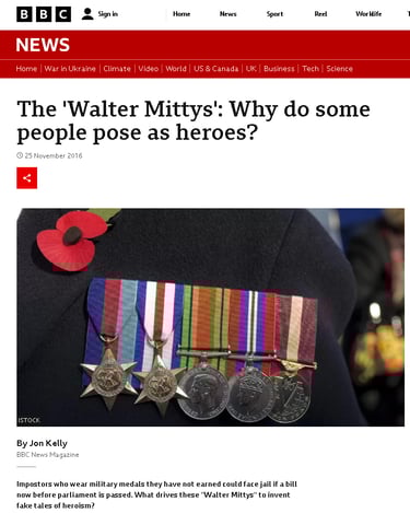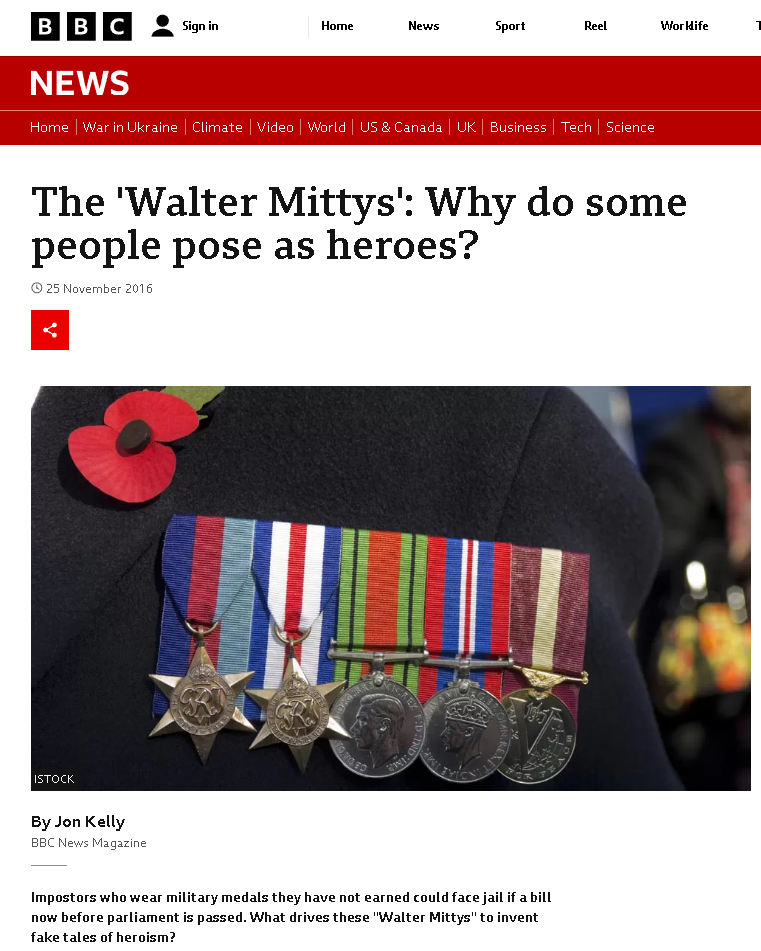 In 2008, bus driver Jamie Barrett was spotted marching in Edinburgh with members of the Parachute Regiment who had served in the Falklands. He had bought his medals online. After he was exposed, Barrett said: "I'm basically a Walter Mitty type of person."