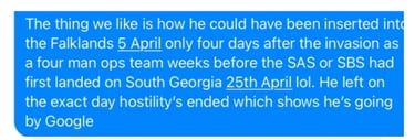According to Webber he and his four man covert team landed on the Falklands 5th April.