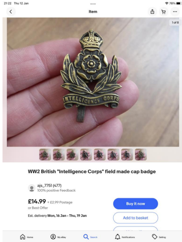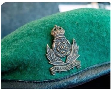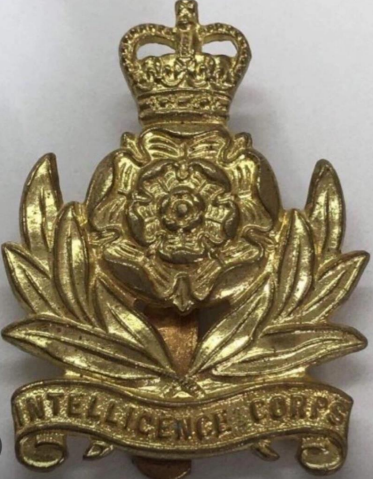 Wearing intelligence corps badge from Second World War;