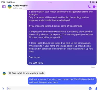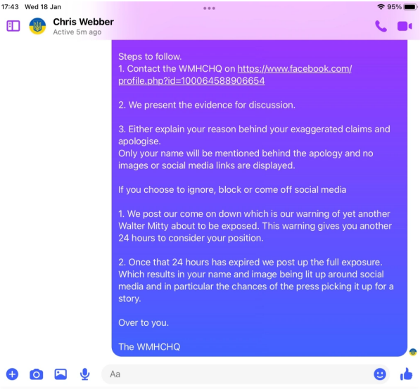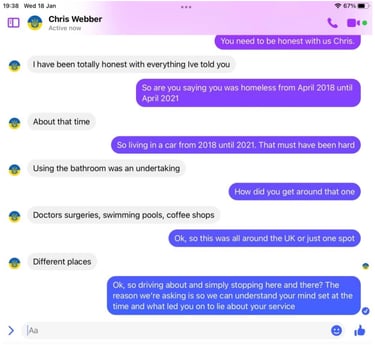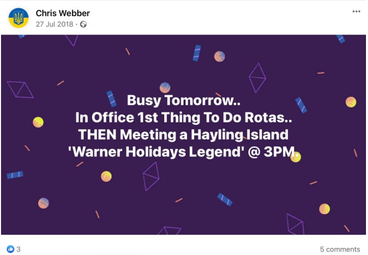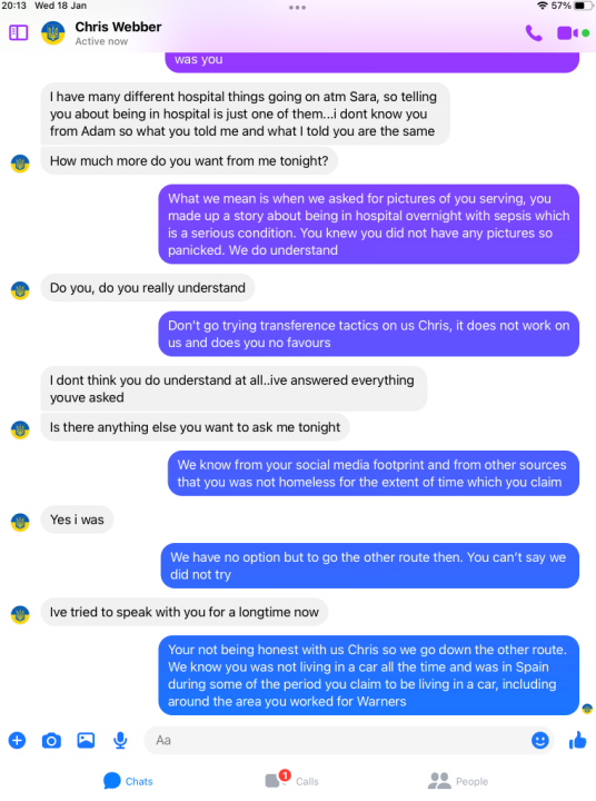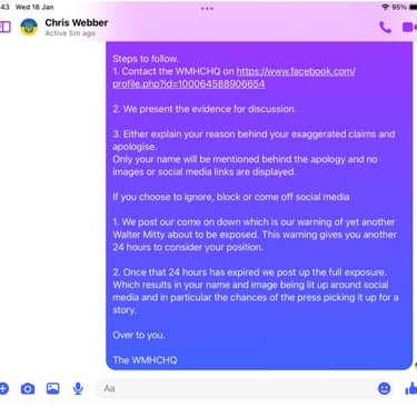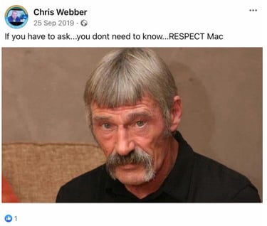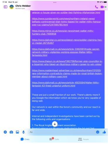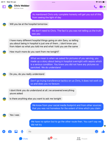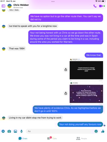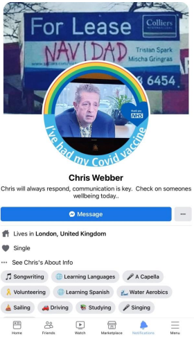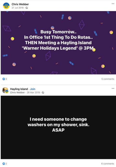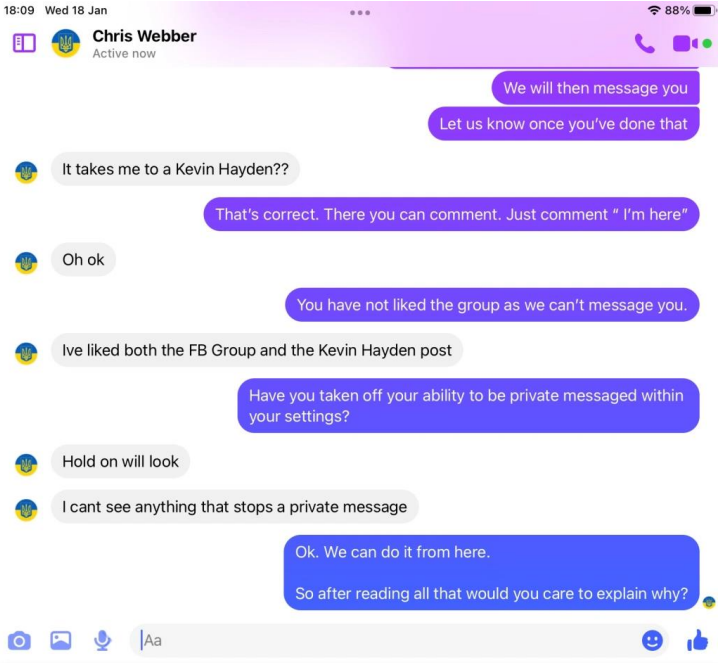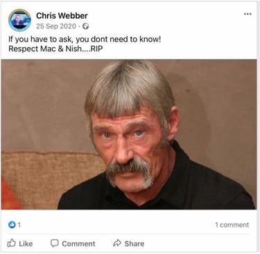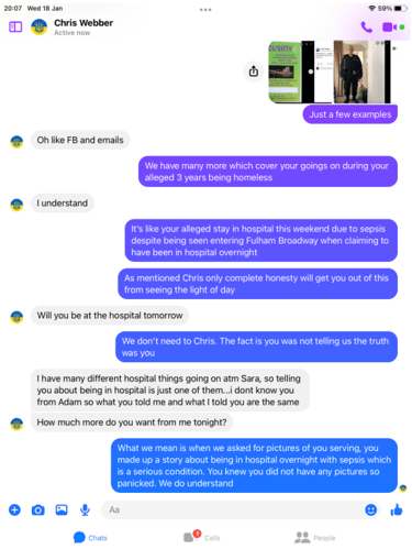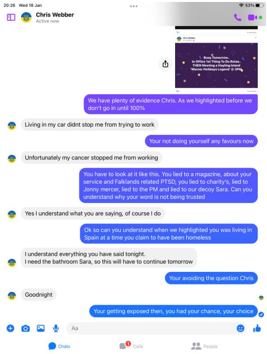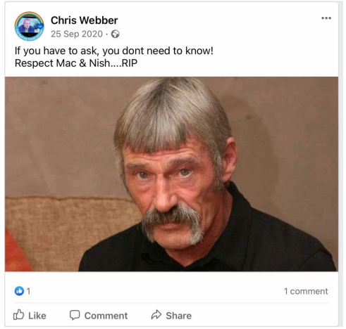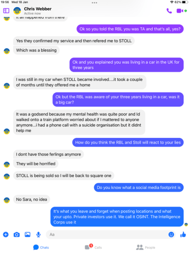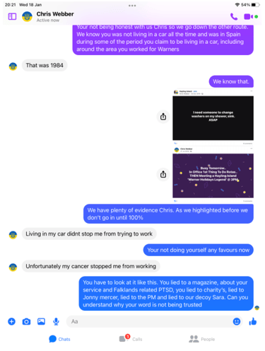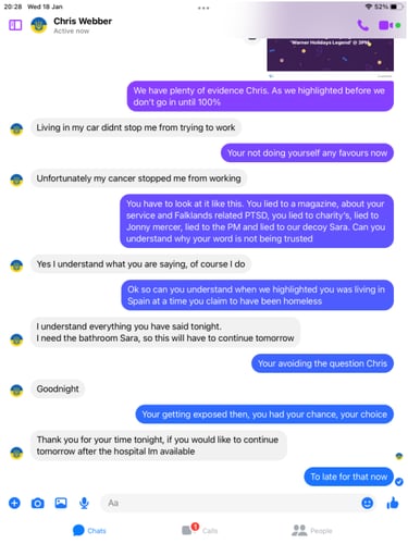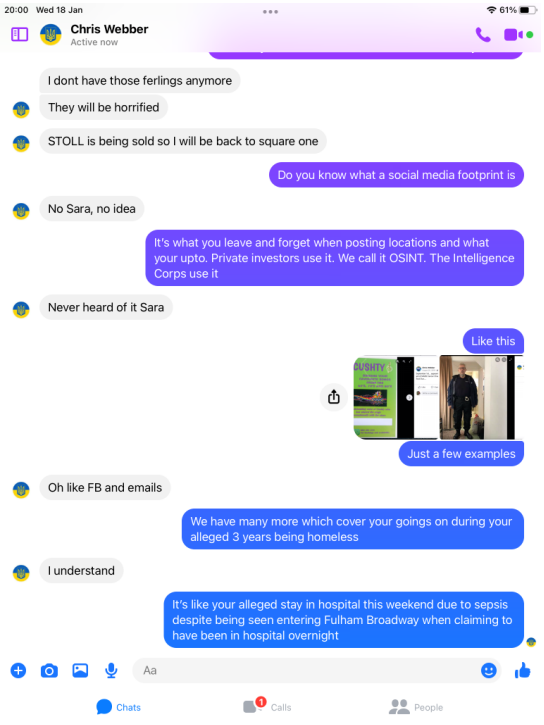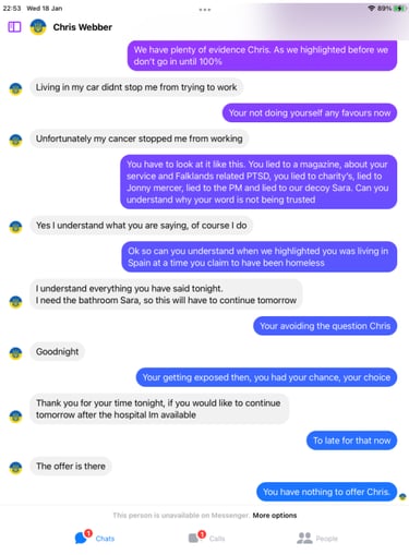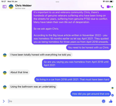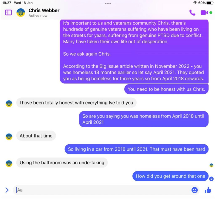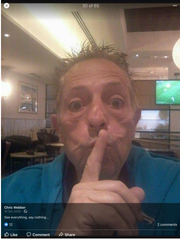 When pressed about his alleged homelessness, Webber became evasive and more so once we pointed out his social media footprint showed he was not as homeless as the big issue article suggested. He then did not want to talk about it. Soon after Webber began the pre exposed Facebook trimming of posts. However, we have it all me old cocker.