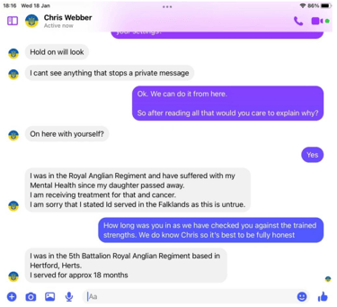 After having a good look through his posts and pictures not one reference could be found of his service in the Falklands or his alleged six years in an infantry regiment other than one grainy picture of Webber passing out as a Police Cadet in 1976.