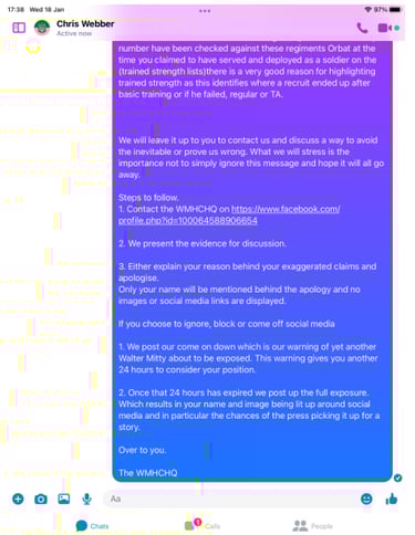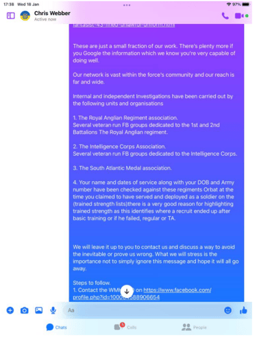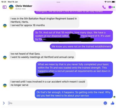 We then moved on to the Royal Anglian regiment which Webber claims to have originally joined in 1977. Former instructors and recruits from 1977 to 1986 were consulted, and not one individual could recall Webber. Again Webbers claims about recruit training and moving to battalion were ripped apart.