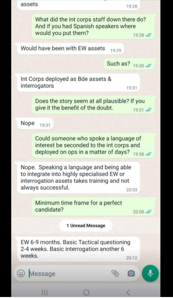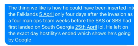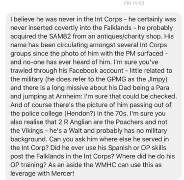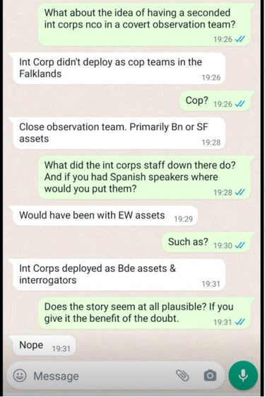 One example of the same reply is from an ex Warrant Officer of the Corps who served in 1982. Out of over 50 responses all made the same observations. 30 members of the Intelligence Corps deployed to the Falklands, all were known and Webber was not.
