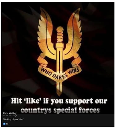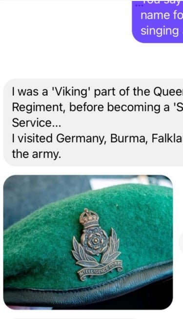 Again we noted no references to having served in the armed forces other than a few suggested posts of having known two well known deceased members of 22 SAS.