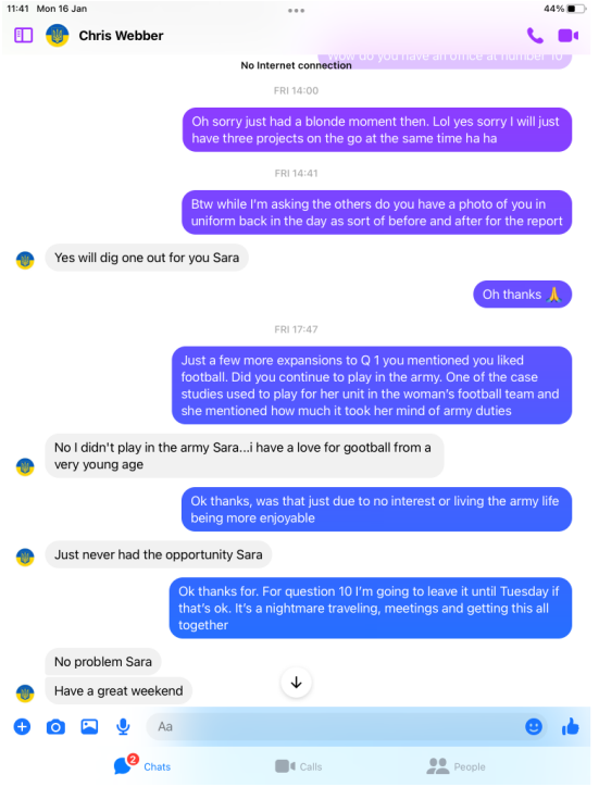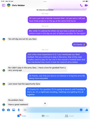 So now we had the subject hooked we set out some open and cognitive loaded questions which our girl would tease more dits from Webber during the expansion phase.