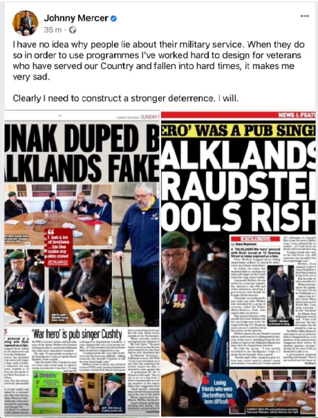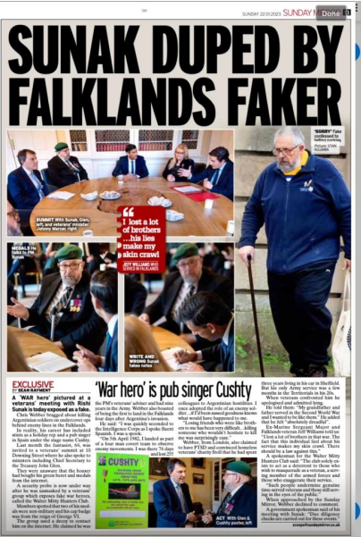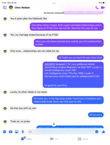 He claimed in The Big Issue to have been homeless for three years and suffering from PTSD because of his experience in the Falklands war after six years of service , so far we have established the Falklands war and six years of service was a complete lie.