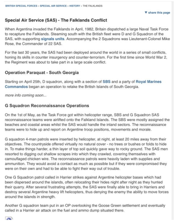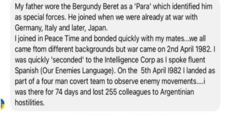 Landed on the Falklands three weeks before the SAS as part of a four man team and spent 72 days there. Says he was a spook – member of the Intelligence Corps;