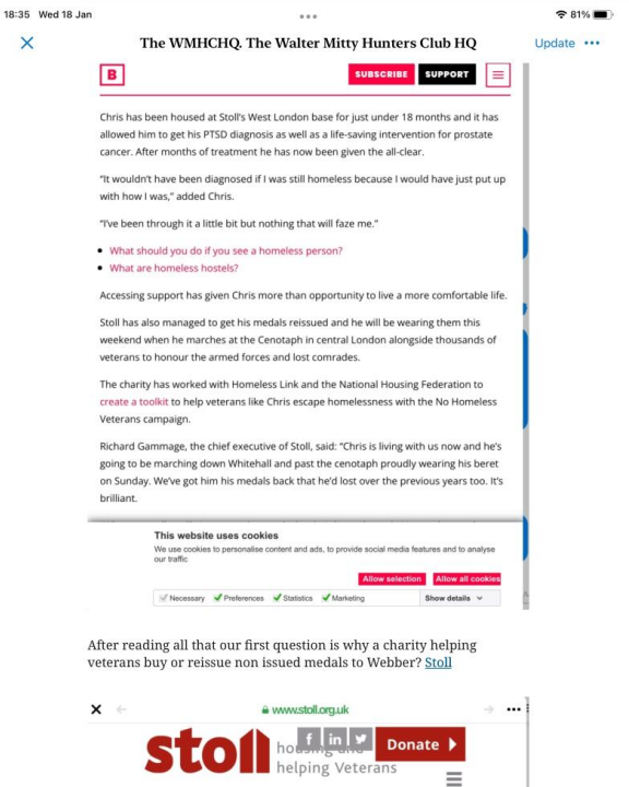 After reading all that, our first question is why a charity helping veterans buy or reissue non issued medals to Webber? Stoll