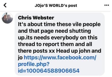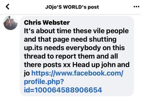 Webster had built up quite a following with his lies and like most Walts and Bloaters with a cult following we’ve exposed all would defend him in droves and call the WMHCHQ nasty bully’s for daring to question their saint. Webster would ask his fan base to report our page. A tactic used simply to stop the truth from getting out.