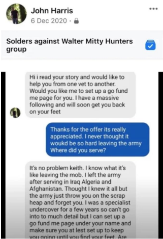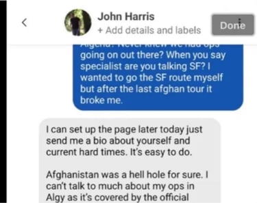 Harris was close to moving in on the armed forces until TWMHCHQ stopped him in his tracts. Harris had alluded to have been in the armed forces when attempting to persuade a veteran he could start a go fund me page for him.