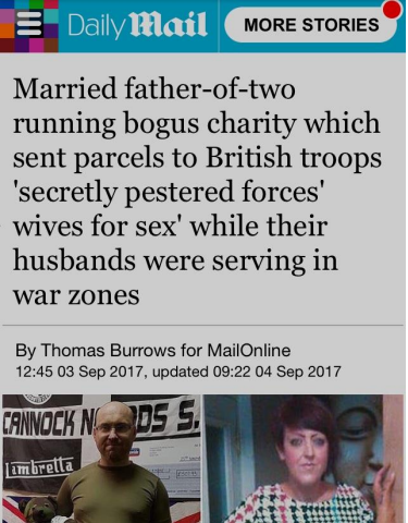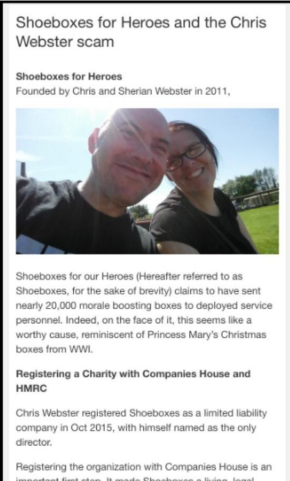 Webster would use Twitter to reach out to Forces pages requesting donations of goodies to stick in his shoe boxes. Only for most of it to end up on car boot stalls or in his loft with only a small token going out to serving deployed in order to keep up the pretence. We noticed Webster’s walting via some of his social media posts so looked deeper and it did not take us long to establish the truth behind Skinflute.