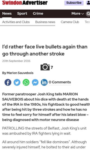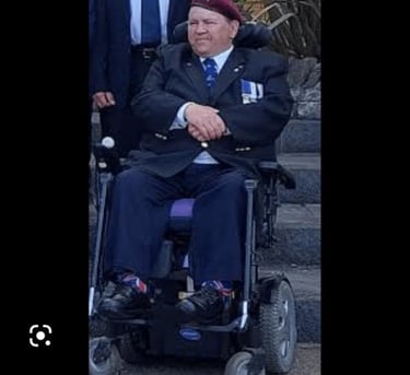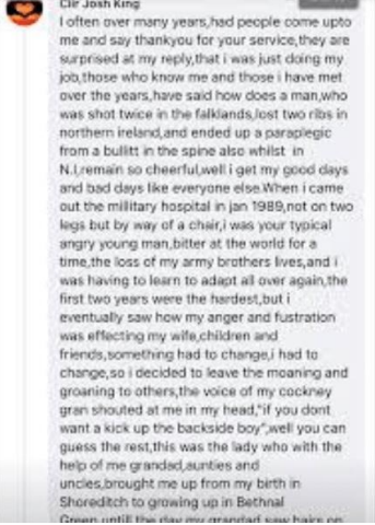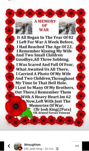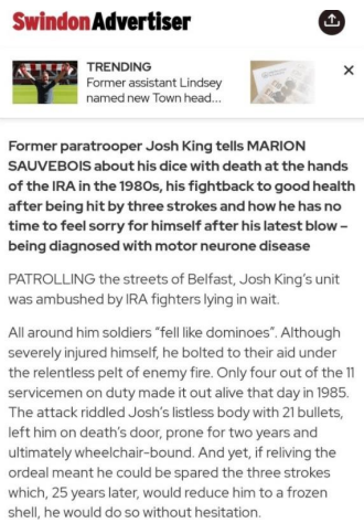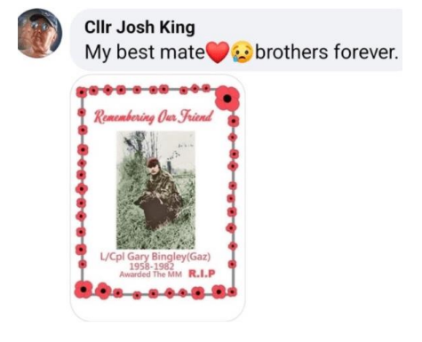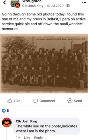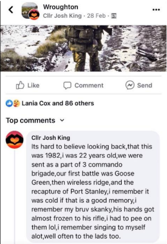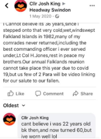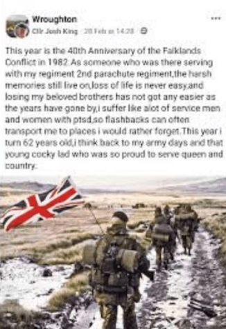King had bragged several times on the local Facebook pages and local Swindon Advertiser about his exploits in the Falklands and NI over the years, so was encouraged to lead the Falklands Parade.