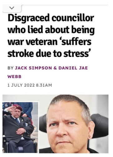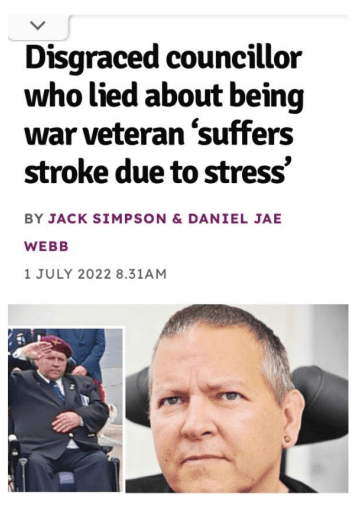 Disgraced councillor who lied about being war veteran ‘suffers stroke due to stress'