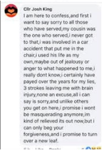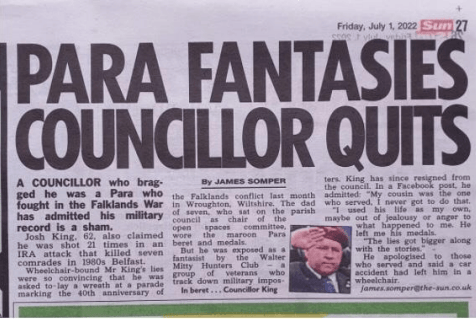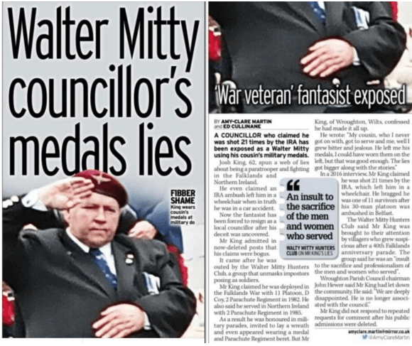 Until the WMHCHQ exposed him for self awarding himself a Queens Gallantry award, claiming to have served as an RMP in the Falklands war and like Jackson, King thought he could do the same…..until now.