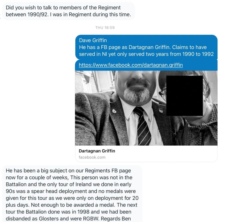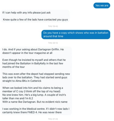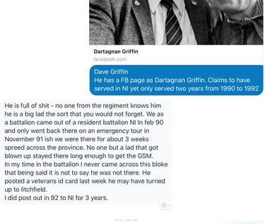We reached out to griffin but he is reluctant to talk as records and former serving show griffin was never on the trained regimental strength so would never have deployed to NI.