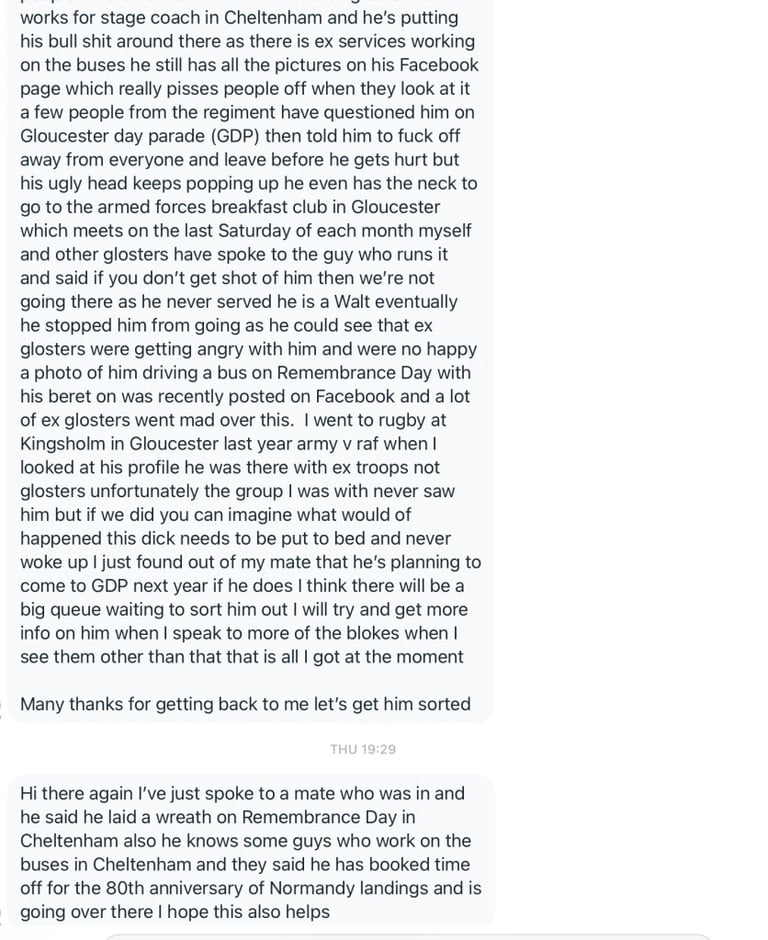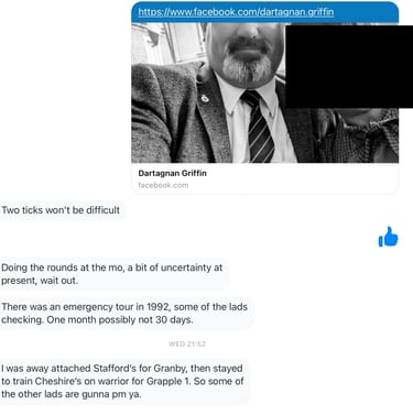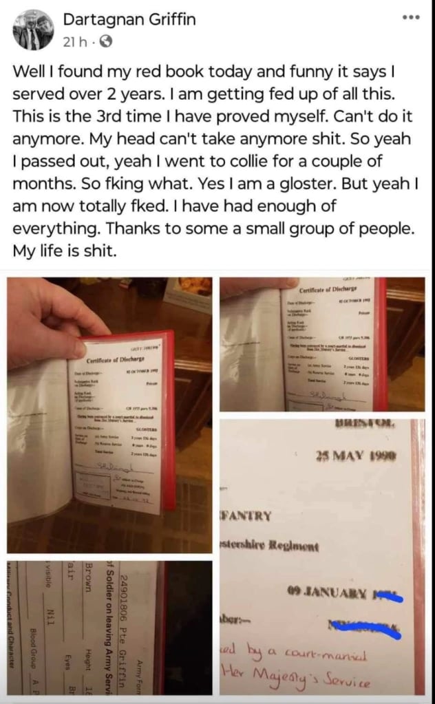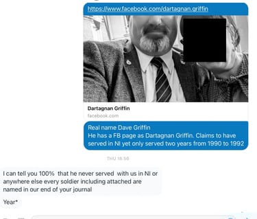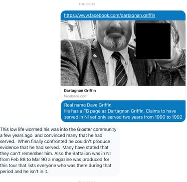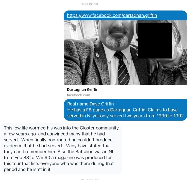Griffin came to our attention after several members of the Gloucestershire Regiment alerted us to his antics which angered genuine veterans. Griffin had already been drummed out of the regimental association. But, after griffin started flaunting a veterans card like a badge of honour the anger and frustration returned. Something had to be done, so TWMHCHQ stepped in.