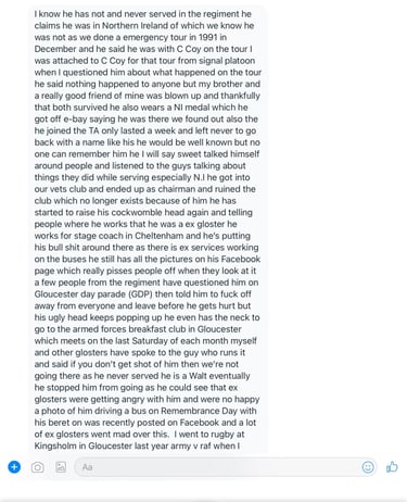 Claims to have served in NI yet only served two years from 1990 to 1992 and likes e bay bling.
