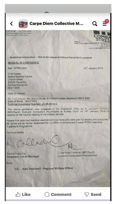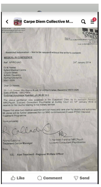 On the basis of being allowed to claim veterans status Jones was able to see an NHS doctor, claim he has PTSD from his time in the armed forces (we know someone else who did that) who in turn refers him to Combat stress and the Royal British Legion to get help.