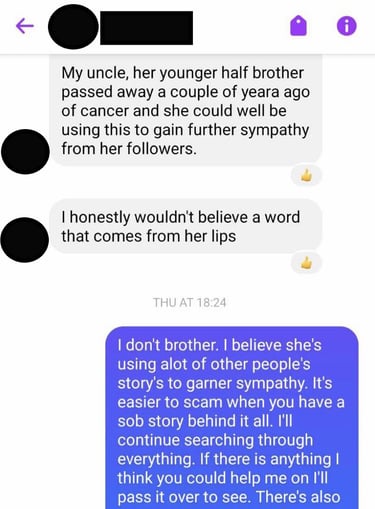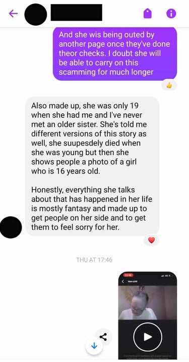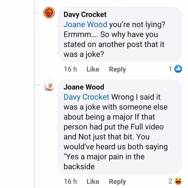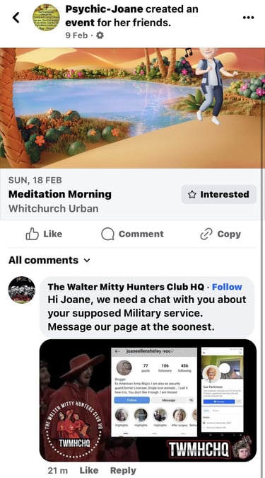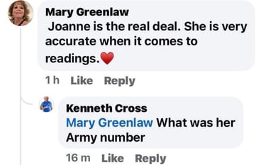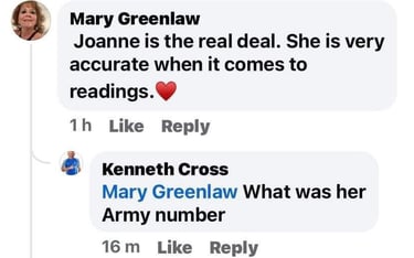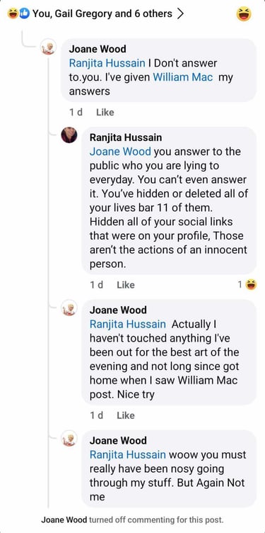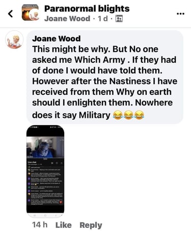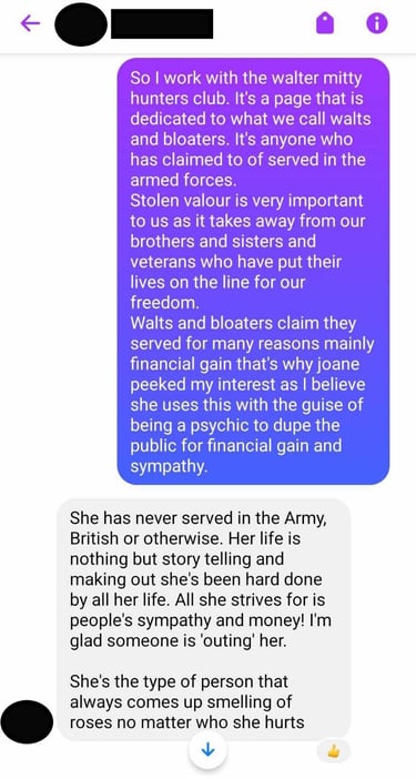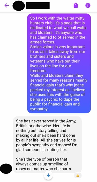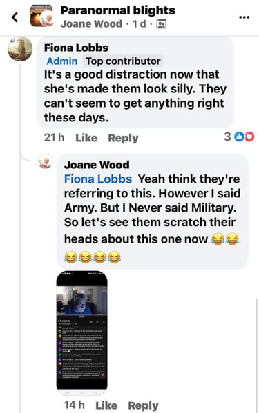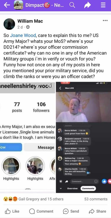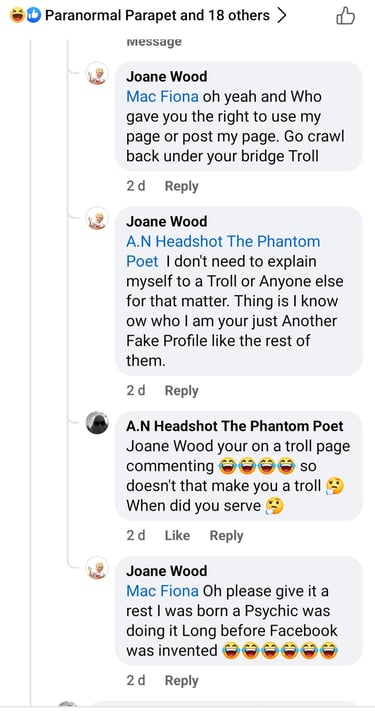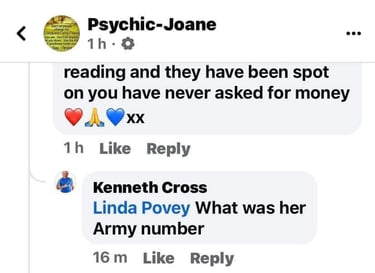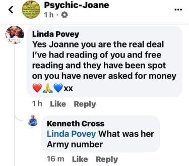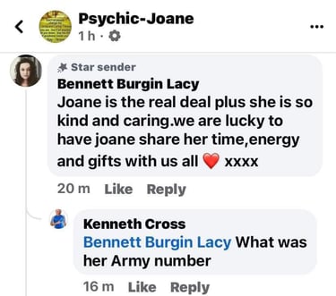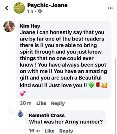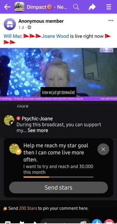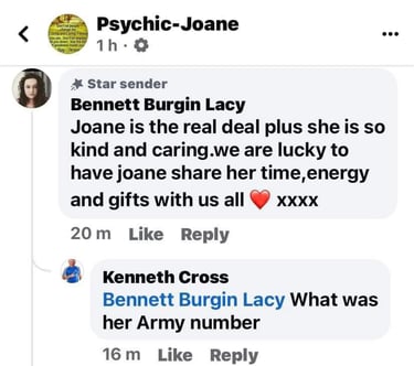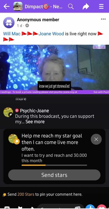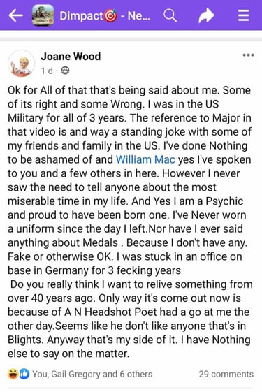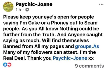 It went quiet... On Joane's behalf, until the next evening when she went live on her Psychic-Joane FB page and then posted this whopper in Dimpact...