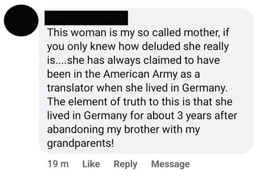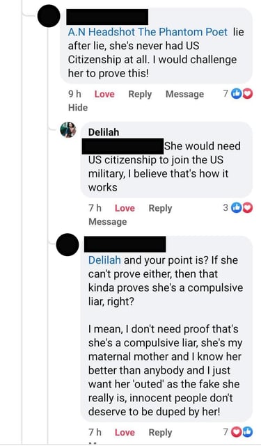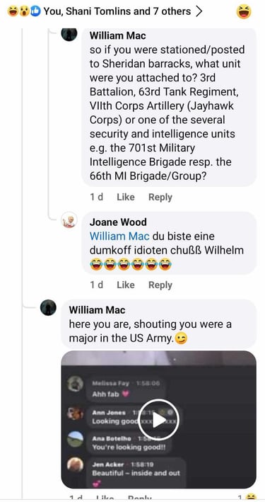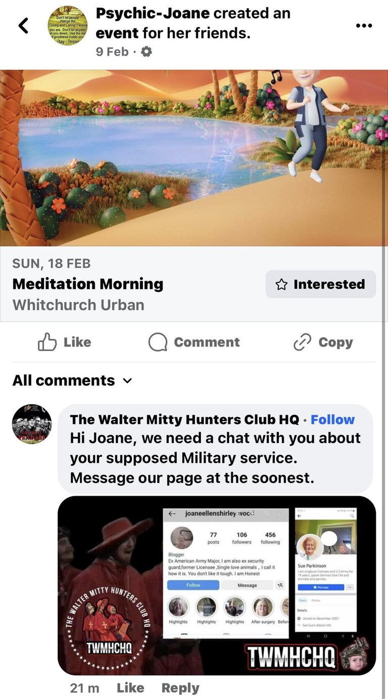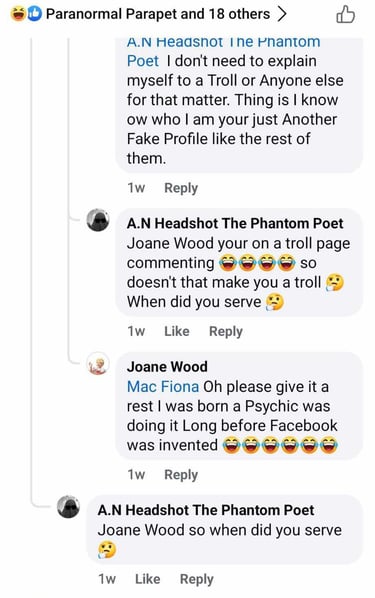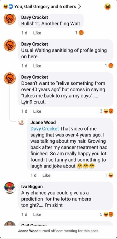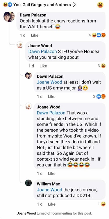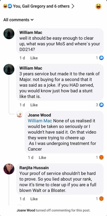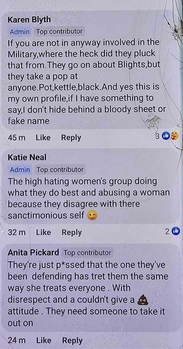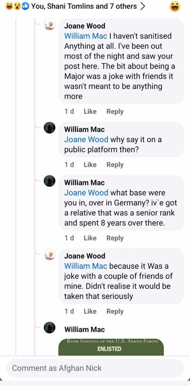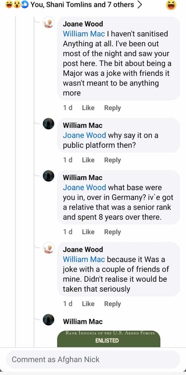 The admins of this group seemed disillusioned, blindsided due to beef they have with Afghan Nick, believing Joane Wood was being bullied, when Afghan Nick was asked by 'us' to drop the clanger, (when did you serve?) in the first place.