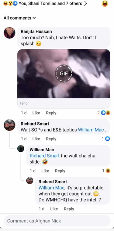 So when we saw Walting Wood commenting on one of A.N Headshot's posts about Sixchins, ironically claiming 'he' was a fake and 'she' was not, we gave Afghan Nick the go ahead to ask the suspected Walt a question that makes them run away and come over all funny...