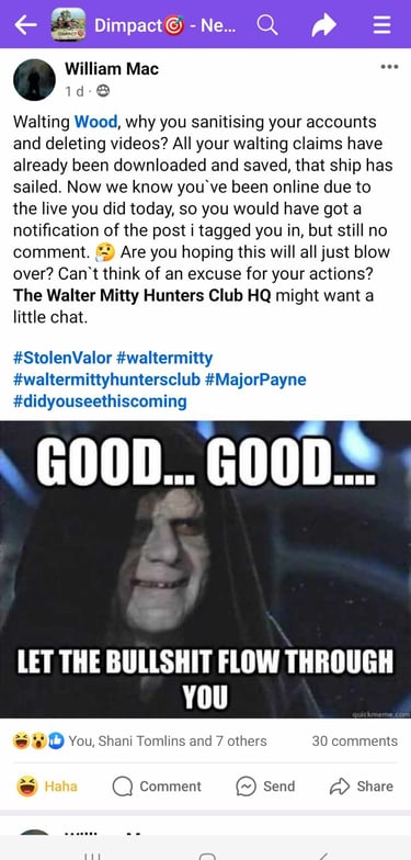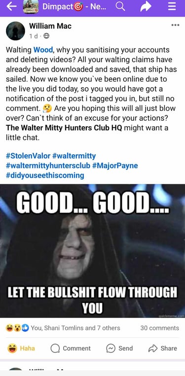 We had intel she likes to frequent another Facebook group Dimpact, where they debate nonce hunters stings amongst other things. So we asked a member to write a post and make Walting Wood come out of hiding...