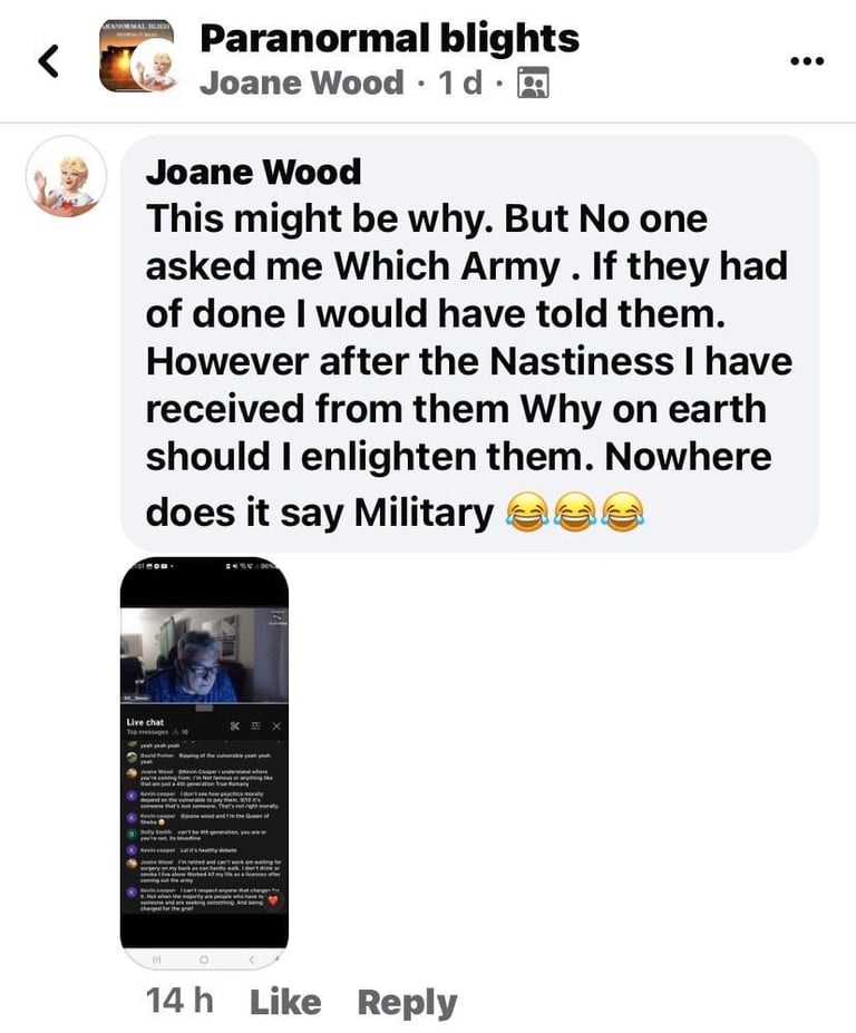 Aaaaaand she turned off the comments, as you can see there have been many excuses, firstly wondering where we had got military from, then she was only in for 3 years, her being a Major was a "long standing joke between friends" well Joane, they are your customers and you made a massive entrance and went into detail, here
