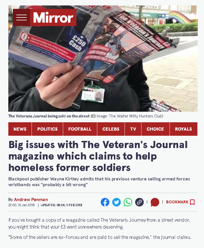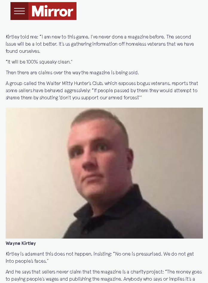 "Awareness News selling scam magazines in Stratford upon Avon yesterday. Got very grumpy when Member of the public enquired as to who they were. Total bluffers who manipulates lax laws in street peddling. These people do not represent veterans."