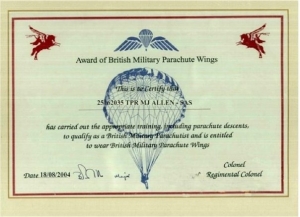 Confusing? you bet! Mark then claimed he earned his British Parachute Wings on a course held in Washington DC in the good old US of A. Strange as the RAF have no such schools out there and the RAF do not run courses for basic students other than RAF Brize Norton in the UK. Checks were made with 2 Group who do authorise the odd out of area courses for HALO but as we thought it was all Billy bollox as was the fake certificate in 2004 the certificate issued looked completely different.