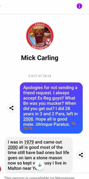 A well respected member of the parachute regiment who served in the Falklands approached Carling after spotting the picture above.