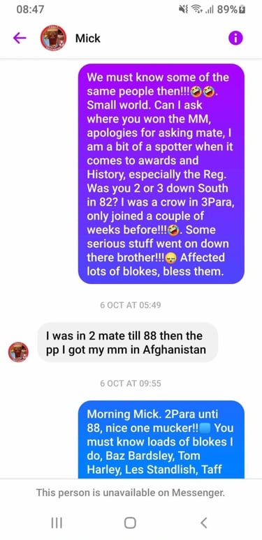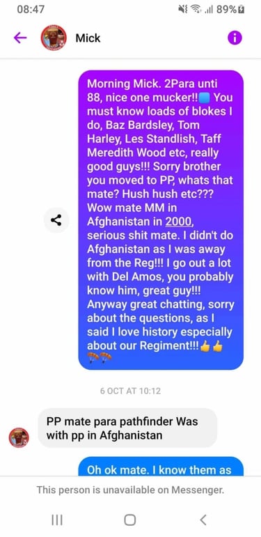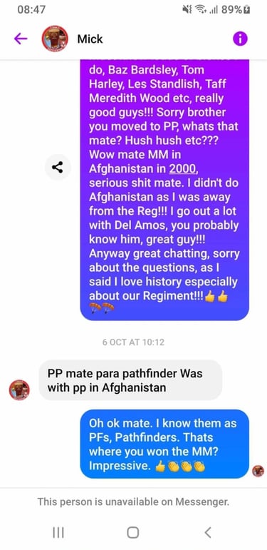 If Carlsberg did Walt’s this would be it. Say hi to Mick Carling. Claims to have served in 2 Para during Falklands war, PF and have an MM from Afghanistan and has the medals, to prove it. He is also sporting a rather snazzy 1 Para blazer badge, despite claiming he only served in 2 Para and PF…..odd.