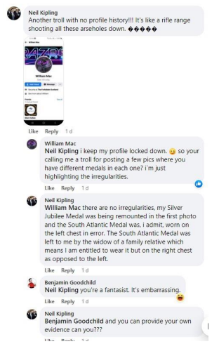 Kiplings actions and response to the allegations alone Proves without a doubt Kipling is an Internet fibber and a total wankpuffin who self awarded himself medals and tried to establish himself as a veteran within his community when he never was.