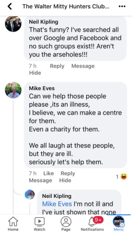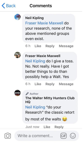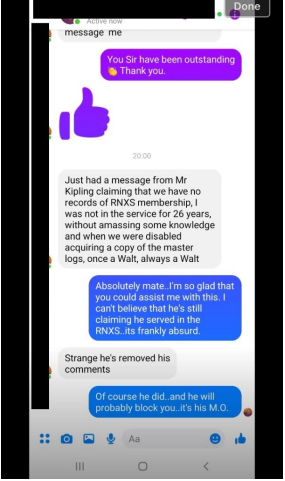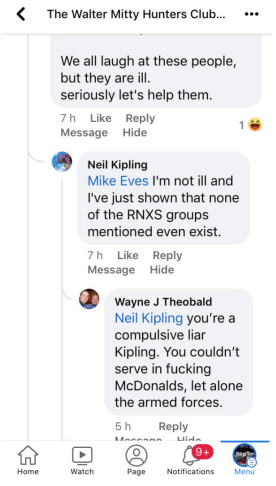 Kipling then retorts with the classic walt deflection line used by so many we have previously exposed “Do your research” then claiming no such groups exist despite Kipling complaining to the moderator of the Ex RNXS group soon after our reveal.