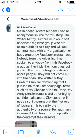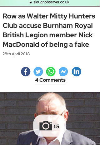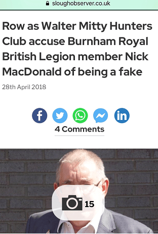 On the Facebook page of the Maidenhead local rag, MacDonald comes out of his hole to rubbish our claims, but soon takes it down as he also exposed himself as being the Admin of the Burnham Royal British Legion Facebook page, who had been vigorously defending MacDonald.
