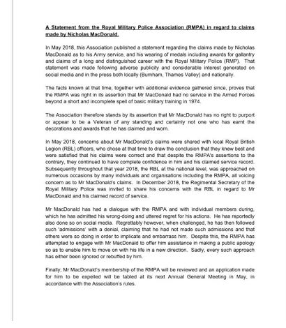 Nick came to our attention after several members were concerned about the claims being made by MacDonald, not only on social media, but press reports and during public speaking and always with an impressive rack of medals including the MM with WO2 rank.