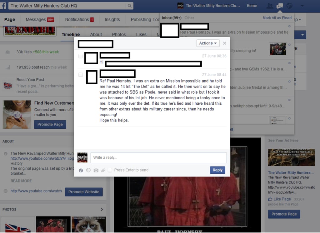 We contacted a Stuntman in South Africa who again confirmed he knew of his SF background through him, but advised us to contact Hornsby direct for further details. (He was unaware of the real reason we were asking him) Read some of the screen shots and make your own mind up. Names have been blanked out to protect sources of information and his face book friends.