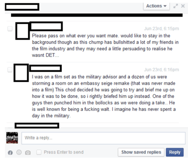 We found his Facebook page, which at the time was open and we were at pains to find any pictures of him in regular uniform from his service other then him on film sets and mostly dressed in Special forces gear, and other than a few ex soldiers from various units on his friends list, mostly ex Royal Marines turned stuntmen or women we drew a blank.