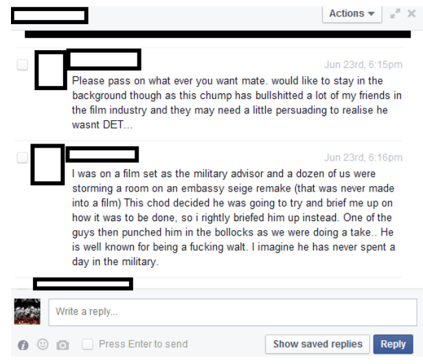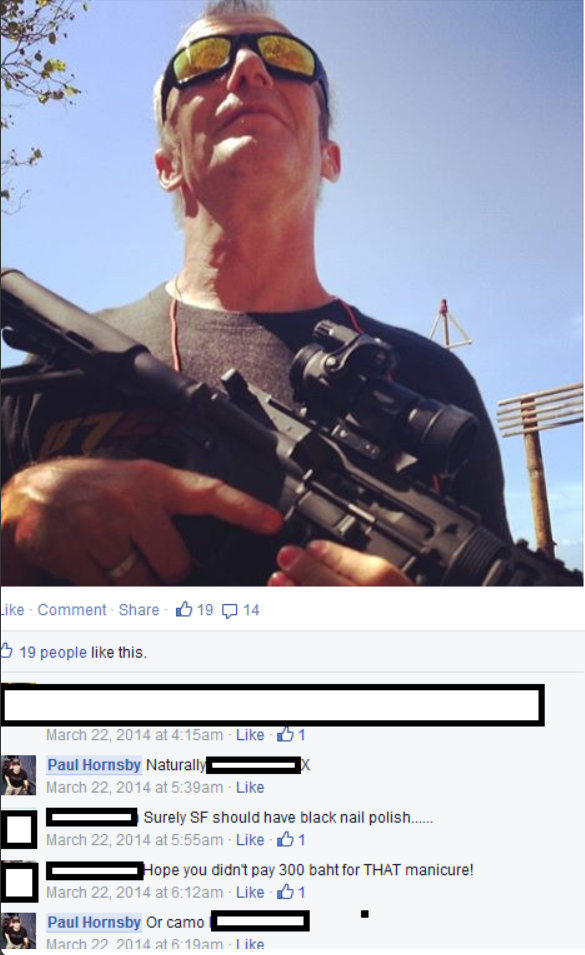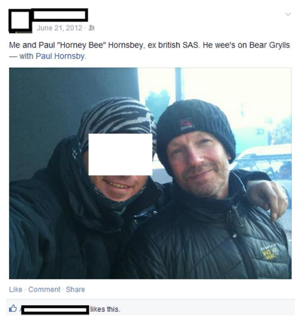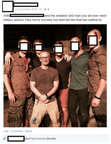 There was plenty of people quite close and in three examples face book friends openly tagging him in pictures and commenting on his Special forces role or Ex SAS past. Paul even likes one such post and comments on another without a single correction and So with no way of knowing his parent unit, the trail went cold as at that point we had no way of knowing 100% if he was or was not. So in the cold file.